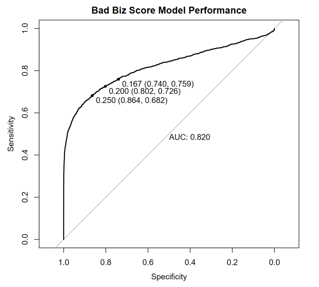 Overall, in this example, we have a decent model predicting whether the investment I am considering is Bad Biz, i.e. not a good idea, something that will loose money. The Area Under the Curve (AUC) = 0.82 in the chart above (which is called an Receiver Operating Characteristic, or ROC, chart) tells us that the model is 82% likely to correctly rank two investment opportunities in terms of their risk of being a bad business (Bad Biz). This is a global assessment of the model performance across thresholds, and takes into account the sensitivity and specificity we have achieved. The higher the AUC the better the model (on average with respect to the thresholds).