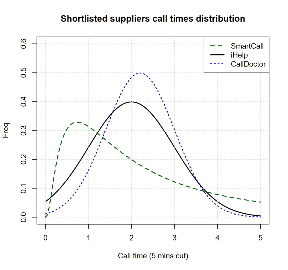 Laura goes back to the suppliers and asks them for a full view of the distribution of call handling times and she finds out the following, summarized in below chart, which she promptly shares with John: